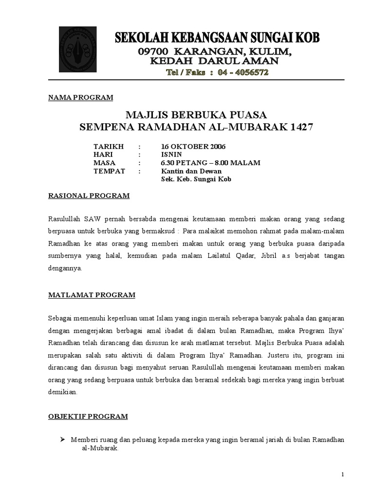 Kertas Kerja Iftar Ramadhan : Contoh Kertas Kerja Program Ihya Ramadan Pendidik2u : Tujuan kertas ini pusat islam/masjid unisel dengan kerjasama pihak pengurusan dan warga universiti memcadangkan majlis ini keberkatan ramadhan beserta keikhlasan hatihati yang hadir dijangka menghasilkan sebuah gaya hidup baru.